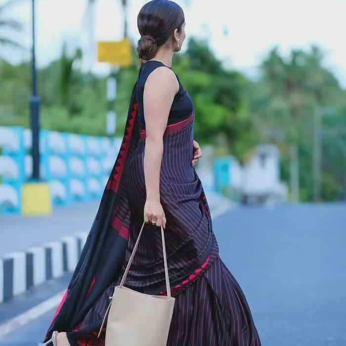 Elegant black saree with fine red stripes and a bold zigzag border, offering a graceful blend of modern simplicity and traditional charm for everyday wear and special occasions.
