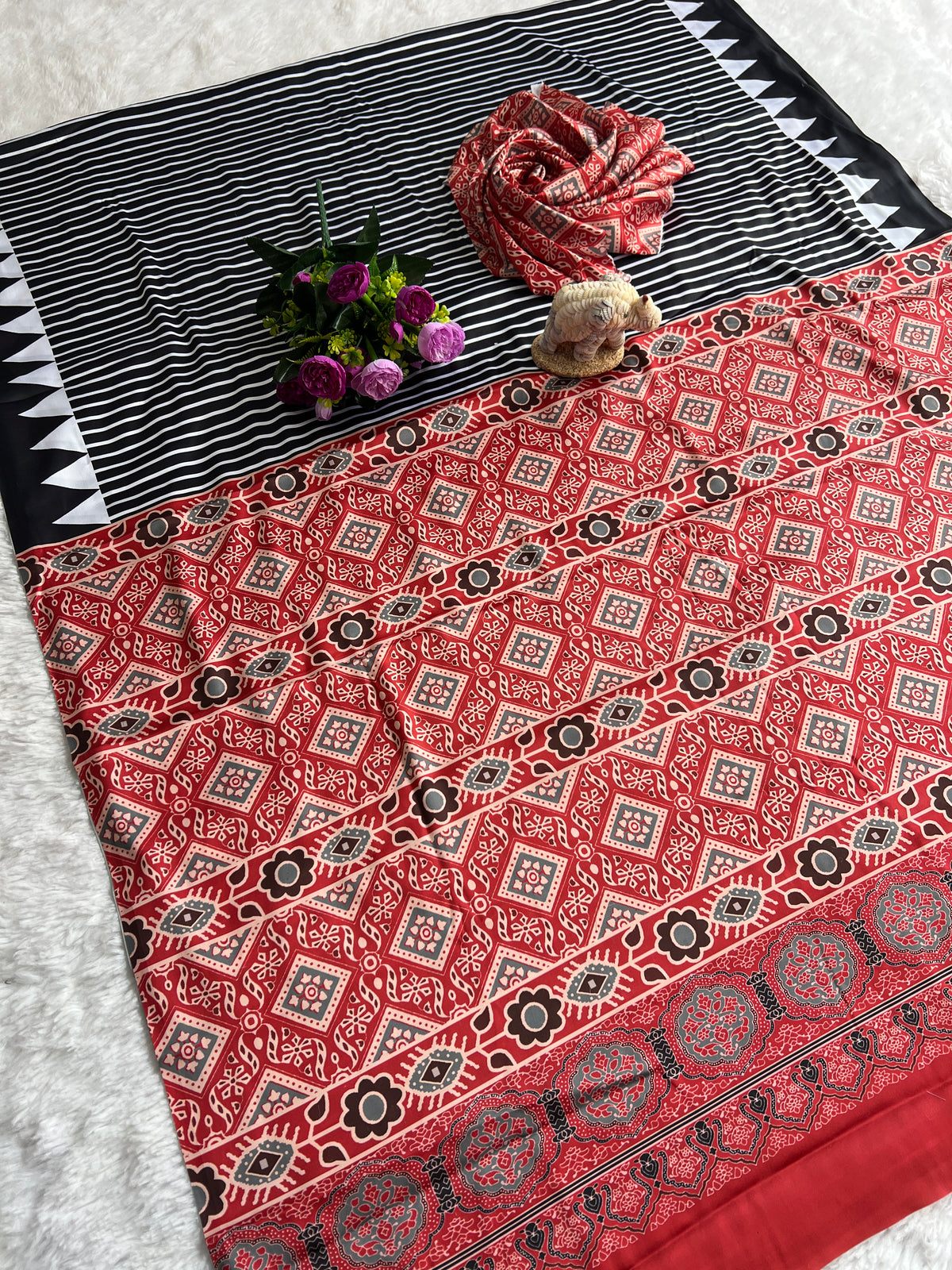 SKU: 2225BlackStripe-Ajrakh Brand: Vastras (replace if needed) Collection: Modern Fusion Ajrakh Series   Saree Specifications Saree Fabric: Soft Silk /...